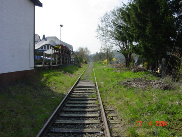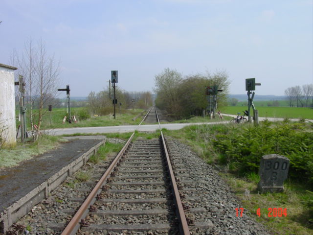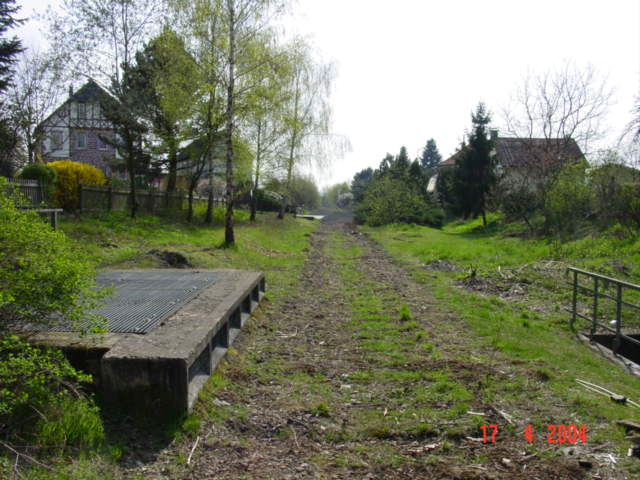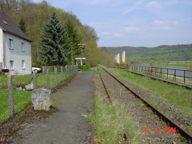 Zur Gewissheit wird diese Erkenntnis vor Ort. Der weit vom EG entfernt stehende Km-Stein zeugt von einst umfangreicheren Gleisanlagen. Wann der Rückbau erfolgte (mit Abbau des zweiten Gleises?) ist unbekannt, vielleicht kann dies ja noch jemand ergänzen.