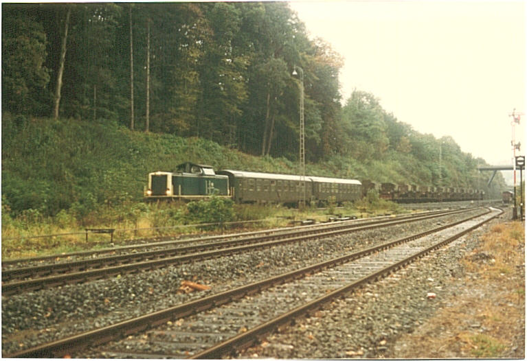 sowie bei der Ausfahrt aus Scherfede Richtung Holzminden. Zu diesem Zeitpunkt war der Bahnhof Scherfede allerdings schon arg gerupft und das EG längst abgerissen.